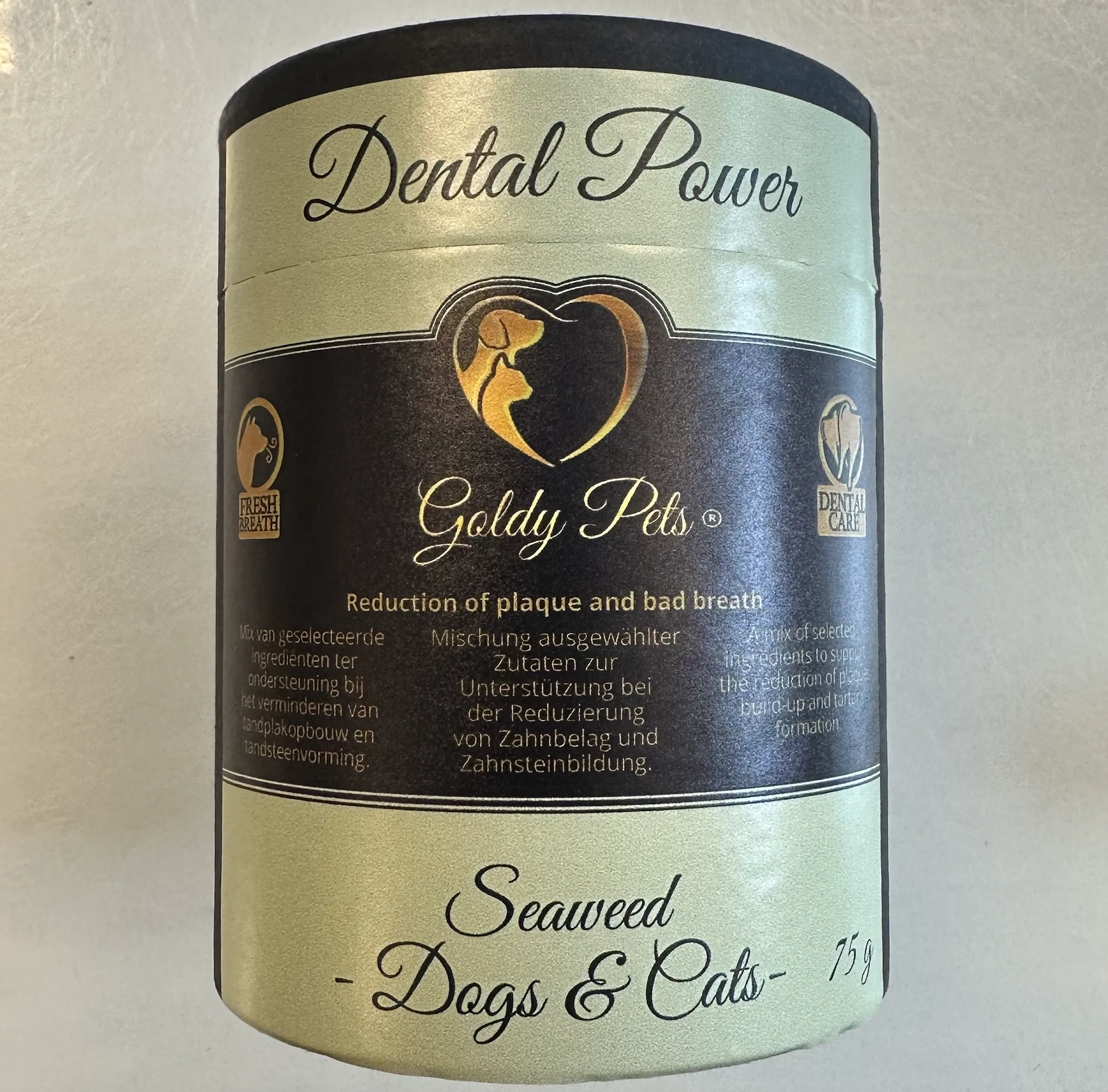 Goldy pets dental power seaweed 75 gr is een aanvullend diervoeder voor honden en katten, ontwikkeld ter ondersteuning van een gezond gebit. De mix van zorgvuldig geselecteerde ingrediënten helpt tandplak en tandsteen te verminderen, ondersteunt een frisse adem en draagt bij aan het algemene behoud van gebitsgezondheid.