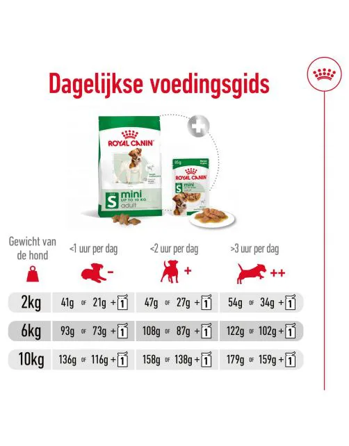 ROYAL CANIN® Mini Adult is ook beschikbaar als natvoeding in overheerlijke saus of gelei. Nat- en droogvoeding combineren zorgt voor variatie in de voeding van je hond, waardoor zijn maaltijden interessanter en boeiender worden. De droge brokken zorgen voor een mechanisch poetseffect dat het gebit gezond helpt houden, terwijl het vochtgehalte in de natvoeding helpt om je hond gehydrateerd te houden en de gezondheid van de urinewegen helpt te ondersteunen.
