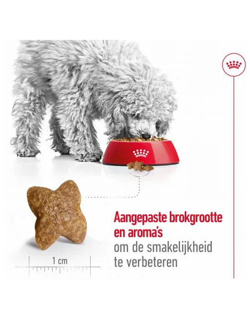 ROYAL CANIN® Mini Adult is een complete en uitgebalanceerde voeding die speciaal is ontwikkeld om te voldoen aan de specifieke behoeften van je kleine hond en hem op volwassen leeftijd te ondersteunen. Deze voeding is ontwikkeld voor kleine honden die tot 10 kg wegen en ouder zijn dan 10 maanden. Kleine honden hebben een opmerkelijk energieniveau. Daarom hebben ze een voeding nodig die is afgestemd op hun temperamentvolle aard en actieve levensstijl, die tegelijkertijd helpt om hun botten gezond te houden. Dankzij zijn zorgvuldig aangepaste caloriegehalte voldoet deze brok aan de hoge energiebehoefte van je hond, en tegelijkertijd helpt de voeding bij het behouden van een gezond gewicht. De voeding bevat ook een combinatie van voedingsstoffen die de botten sterk en gezond helpen te houden. Kleine honden kunnen erg kieskeurige eters zijn. Deze voeding bevat niet alleen een selectie exclusieve aroma’s om hun eetlust te stimuleren, maar de brok is ook aangepast aan de erg kleine kaken van deze kleine honden. Zo krijgen kleine honden, waaronder zelfs de meest kieskeurige eters, de essentiële voedingsstoffen binnen die ze nodig hebben.